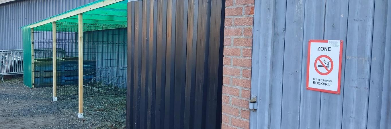 voetbalclub in Eeklo, we zijn klaar voor een rookvrije sportomgeving met een verkeersbord op de oprit en een overdekte plaats buiten het complex voor de rokers