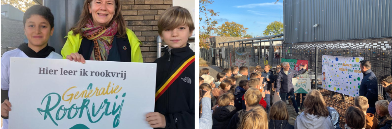 “We bezorgden alle schooldirecties het nodige communicatiemateriaal zoals infoteksten en foto’s om het personeel, de leerlingen en de ouders te informeren via hun schoolkrantje en de digitale tool ‘Smartschool’. Ook bestelden we voor de scholen de gratis “Hier leer ik rookvrij”-borden van Generatie Rookvrij. Die werden aan alle schoolpoorten bevestigd.”
