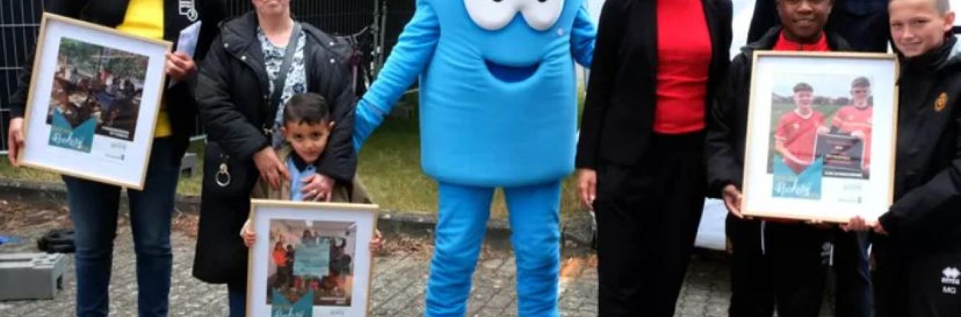 Stadsmascotte Rommy heeft in de marge van de 1000 km voor Kom op tegen Kanker de winnaars in de bloemetjes gezet van een fotowedstrijd voor jeugd- en sportwerkingen in het kader van Generatie Rookvrij.