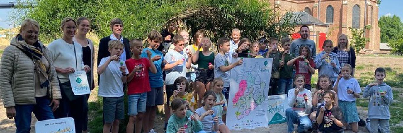 Leerlingen van basisschool De Toverboom in Geel blazen bellen op de speelweide nabij de school. Griet Smaers: "Ook in Geel vinden we het belangrijk dat onze kinderen gezond en in een kansrijke omgeving kunnen opgroeien, zonder geconfronteerd te worden met rook. Daarom vinden we het belangrijk om dit initiatief te ondersteunen".
