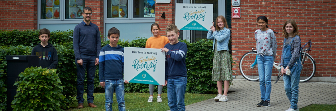 Daarom voorziet de Vlaamse overheid en het Vlaams Instituut Gezond Leven, met steun van de onderwijskoepels en het GO! van de Vlaamse gemeenschap, Kom op tegen Kanker en de Stichting tegen Kanker voor elke vestigingsplaats een gratis signalisatiebord en sticker met daarop de boodschap ‘Hier leer ik rookvrij’.